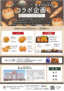 情報ビジネス科2年生(145名)が地元である鹿児島の活性化に貢献するため、授業を通して地元企業の皆様と共同で商品開発に取り組んでいます。今年度もSHIROYAMA HOTEL Kagoshima様とコラボしたパンとさつま揚げを2月21日(金)~3月5日(水)にSHIROYAMA HOTEL Kagoshima(メゾンドファヴール,薩摩美味 玉撰)様で販売することが決定しました!