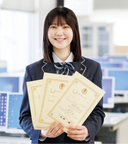 中学まではパソコンに触れる機会が少なく、ビジネスに関する専門的な知識もゼロの状態で入学。そこから情報ビジネス科でパソコンの基礎知識やビジネスソフトの使い方などを学ぶうちに、勉強がどんどん楽しくなり、今まで受けた情報処理の検定は全て合格するまでに成長できました。もちろん私1人の力ではなく、検定対策のプリント配付など、先生方の手厚いサポートのおかげでもあります。鹿高は生徒数の非常に多い高校なので、学校行事の規模も想像以上。鹿高祭や体育祭などは迫力がありますし、クラスマッチもとにかく盛り上がります。友達や先生にも恵まれ、『1530色の青春』という言葉のとおり、私色の青春と呼ぶのにぴったりの充実した高校生活を過ごしています。