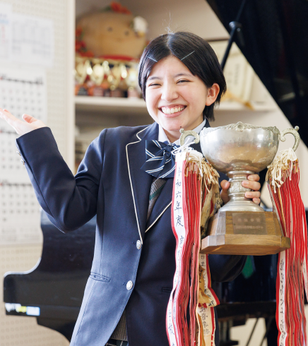 中学の時にコンクールで聴いた音楽部の歌声に惹かれ、憧れを持って鹿高に入学しました。定期演奏会に向けて部員一丸となって練習したり、衣装を製作する時の団結力は音楽部の自慢。顧問の片倉先生と副顧問の石川先生は、部員それぞれが輝けるように丁寧な指導をしてくださいます。この経験を活かし、たくさんの子どもたちが音楽に触れられる場所を作るのが私の夢です。